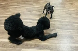 今日は仲良しペアのスタンダード・プードルのトトロちゃんとフレンチ・ブルドッグのハルちゃんが、楽しそうにプロレスしていました😊