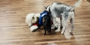 今日はオーストラリアン・ラブラドゥードルのワンちゃんとシベリアン・ハスキーのワンちゃんとミックスのワンちゃんが仲良くコミュニケーションとっています🐾