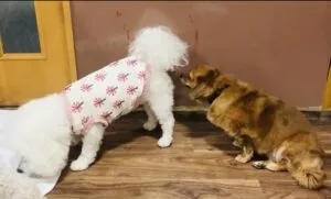 今日はミックスのワンちゃんがビション・フリーゼのワンちゃんにご挨拶してくれました☺️✨